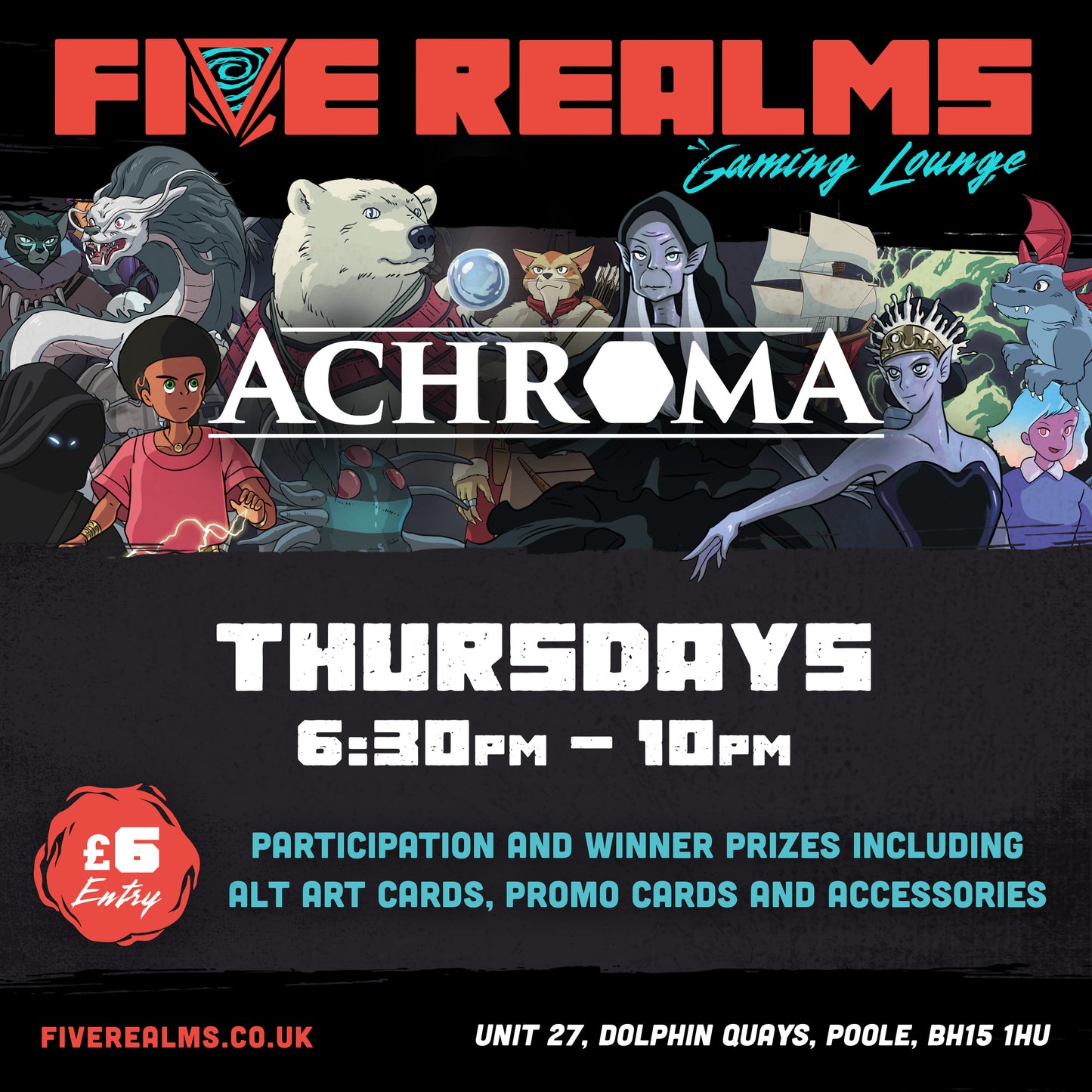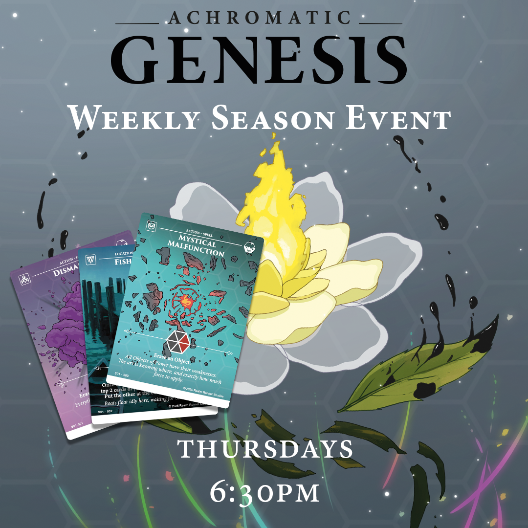 Paint the Realms! Join us at Five Realms for our flagship Achroma night. Featuring a rotating suite of formats with alt arts and promos galore.